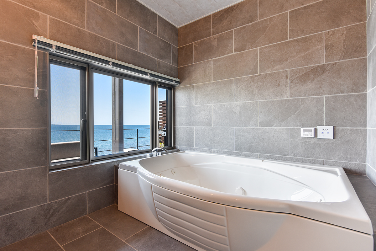 ジェットバスが体に心地よい刺激を与え、高いマッサージ効果を得られます。浴室からもオーシャンビューが望めます。